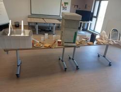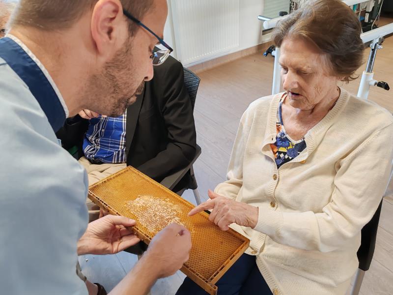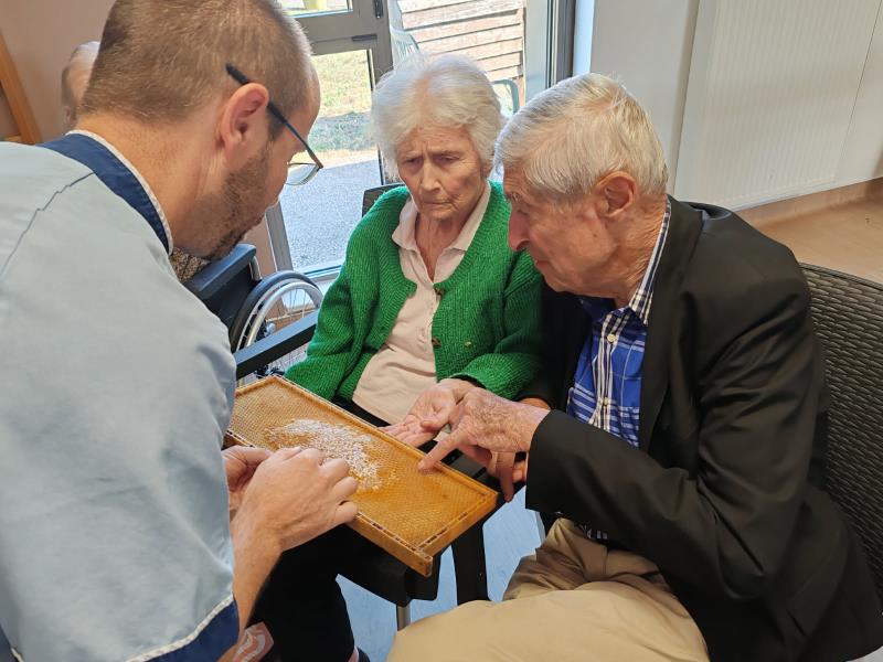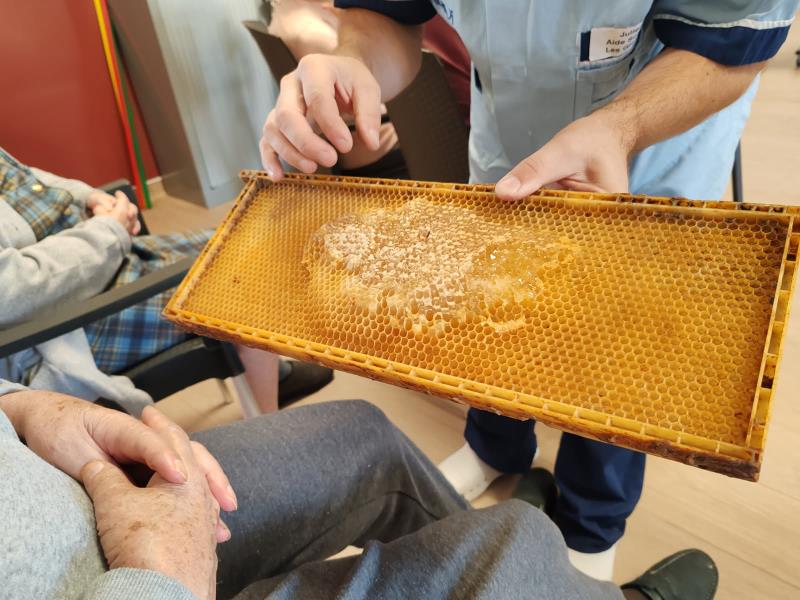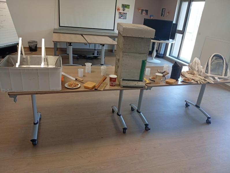 Lors d'une après-midi Julien, accompagné de Delphine, a partagé sa passion pour l'apiculture. Il a présenté les différentes étapes de la fabrication du miel, de la récolte à l'extraction des cadres. Chacun a pu observer la cire et sentir l'odeur du miel fraichement extrait.