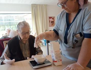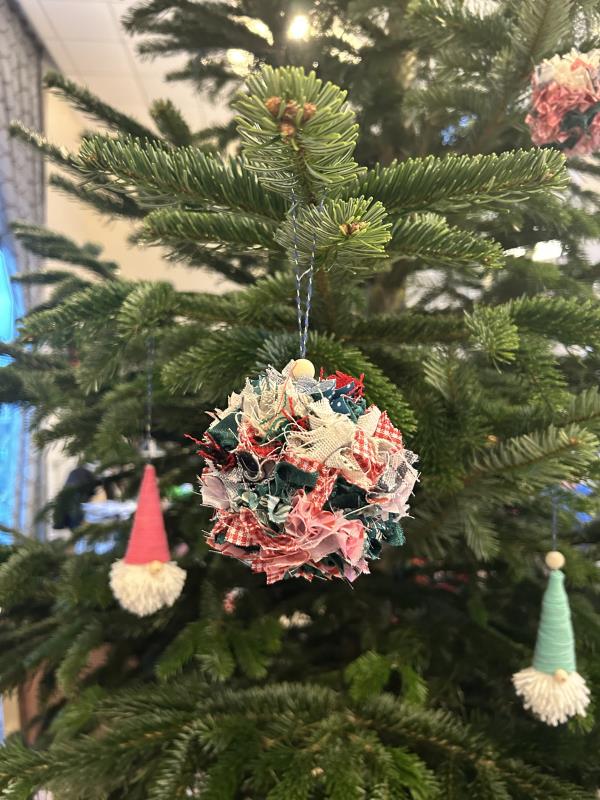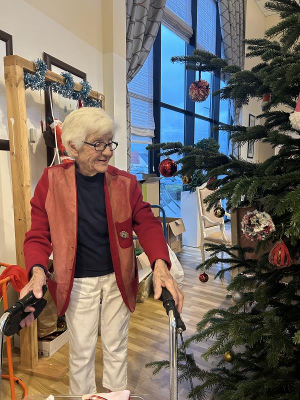 Avec l'aide de Séverine, notre animatrice, les résidents ont participé à sa décoration. Chacun a pu accrocher des guirlandes et surtout les boules de Noël qu'ils avaient réalisés avec Mme Martin, la fille de Mme Langlois, lors d'un atelier créatif.